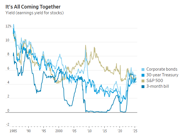 这里的对比,使用到的是股票的盈利收益率(即市盈率的倒数:每股收益除以股价)、三个月期美债收益率(视作现金),以及10年期和30年期国债收益率,再加上ICE BofA美国公司债券指数收益率。