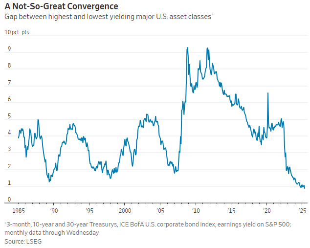 如下图所示,美国主要资产的最高和最低投资收益率之间的差距是40年来最小的,这一差距在去年11月美国大选后就一路下降并保持在低位。